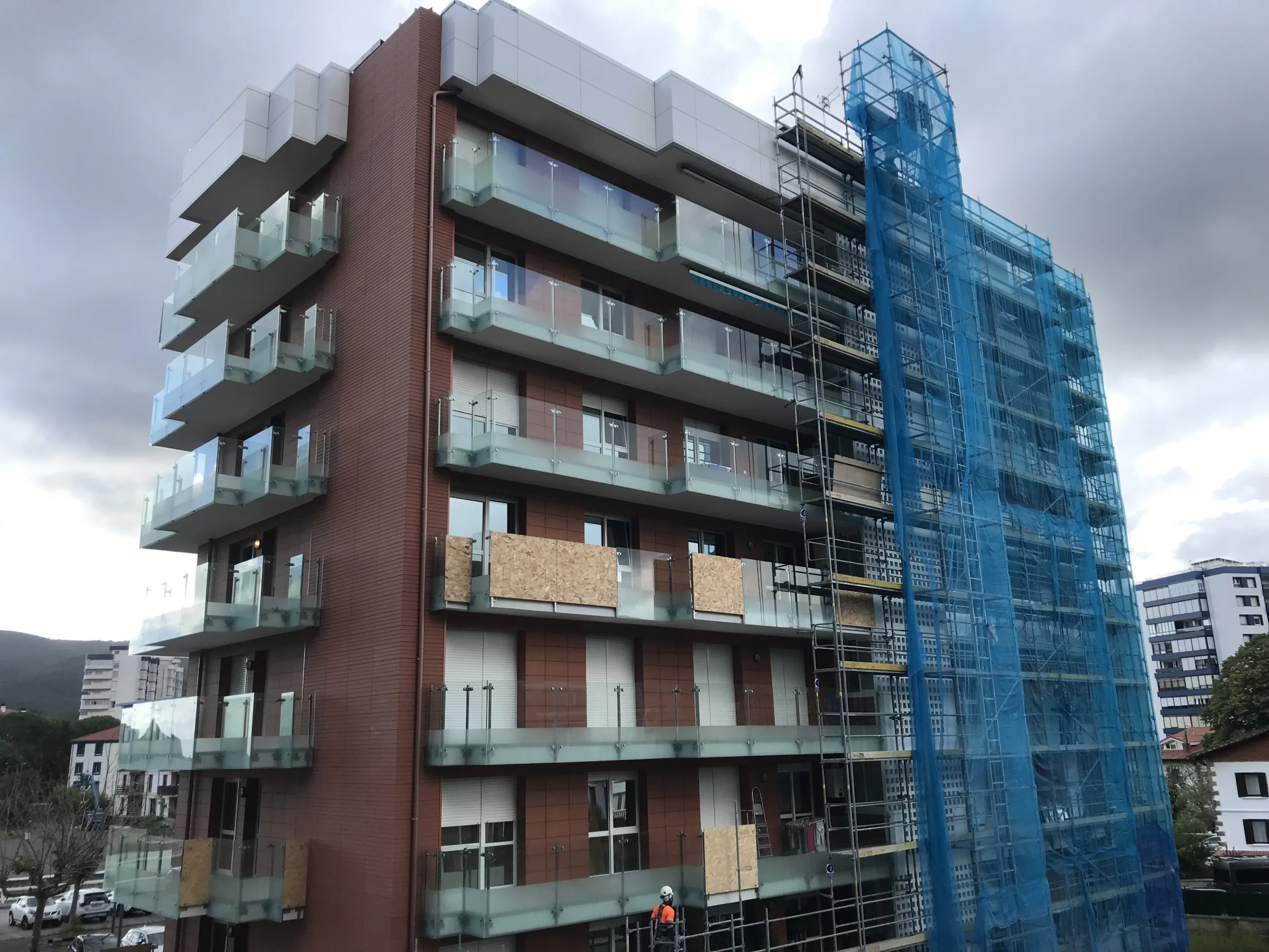 La actuación incluye la renovación completa de terrazas, sustitución de petos por barandillas de vidrio y actualización estética del edificio, mejorando su imagen.