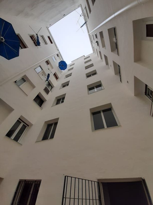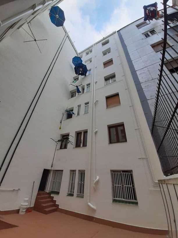 Rehabilitación tradicional de los patios interiores de un edificio de viviendas. Tras sanear la superficie y hacer reparaciones estructurales, lucimos toda la superficie y aplicamos pintura, consiguiendo una mejora tanto estética como funcional de los patios interiores de la Comunidad.